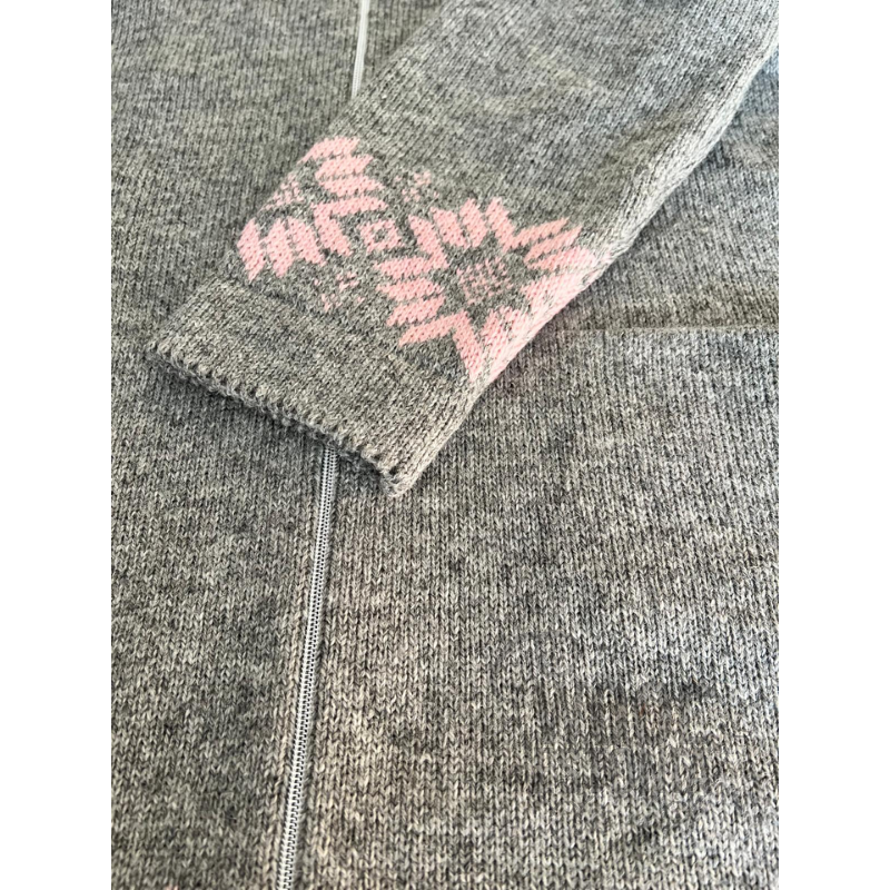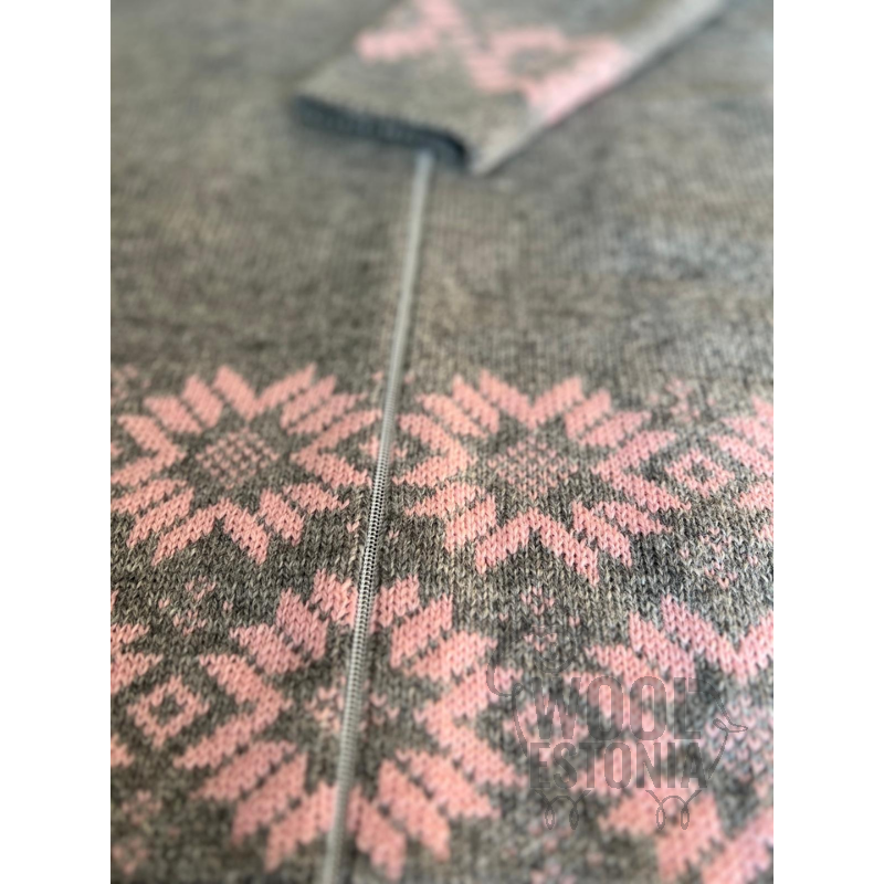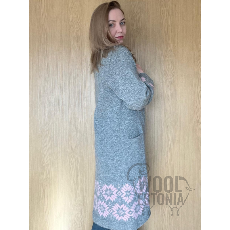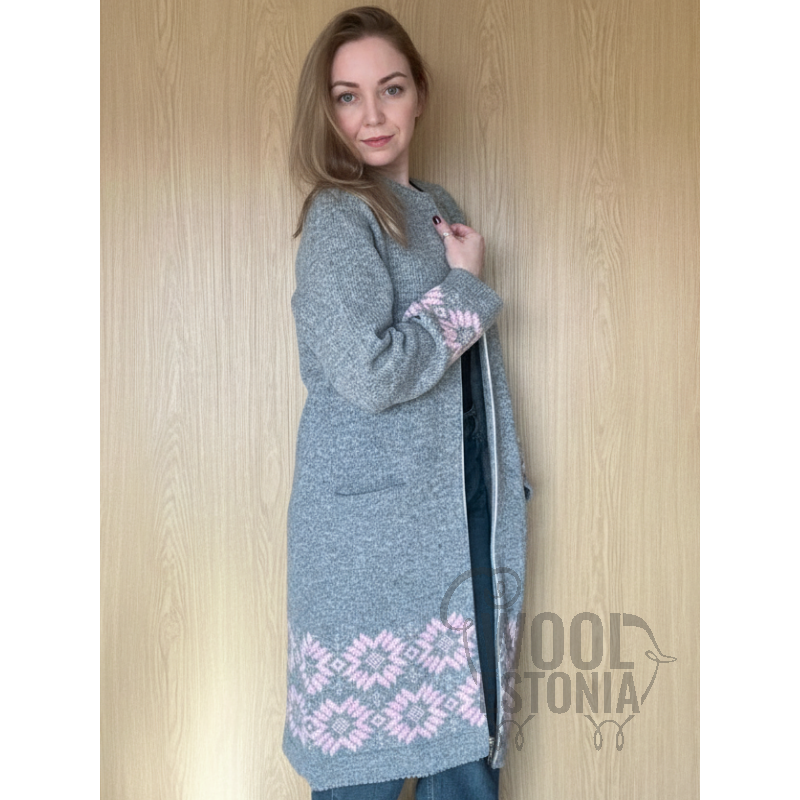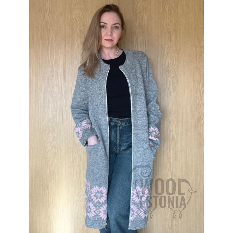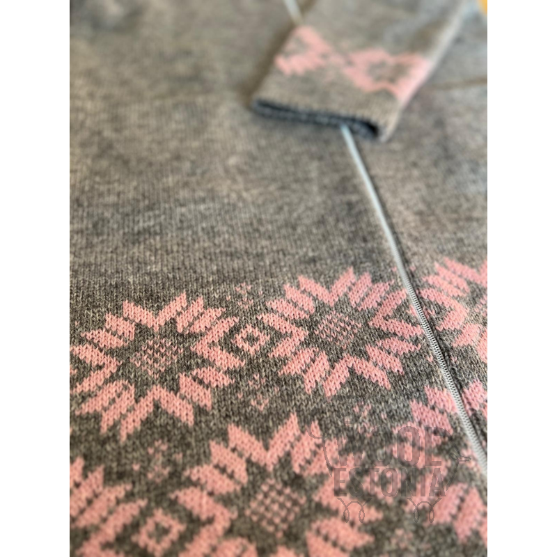 Long relaxed fit with flower pattern in pink tones on the sleeves and hem. Warm, soft, and stylish.