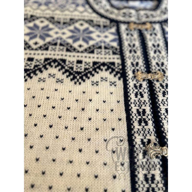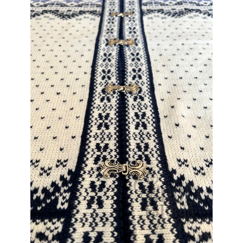 Sweater with an elegant clasp is made out of natural wool, so you will feel comfortable wearing it even in the coldest weather. Moreover, this item can be worn both as a comfortable sweater and an elegant cardigan. Sweaters with Estonian pattern go well with jeans, tube skirts, flared skirts, woolen shorts and skinny pants.
