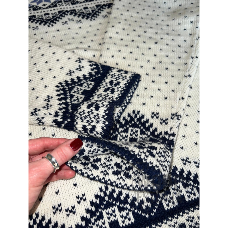 Elegant jumper with a combined polka-dot pattern with snowflakes and deer is a suitable option for those who choose comfortable yet stylish clothes. Sweater will become a center-piece of your working look in the office or will help you keep warm on a mountain ski resort in front of a fireplace with a cup of tea.