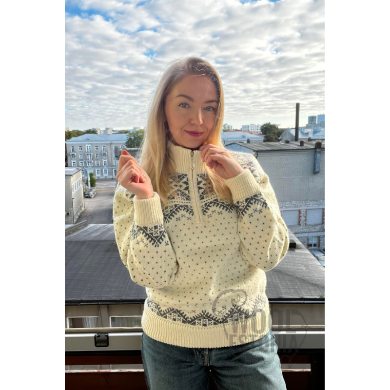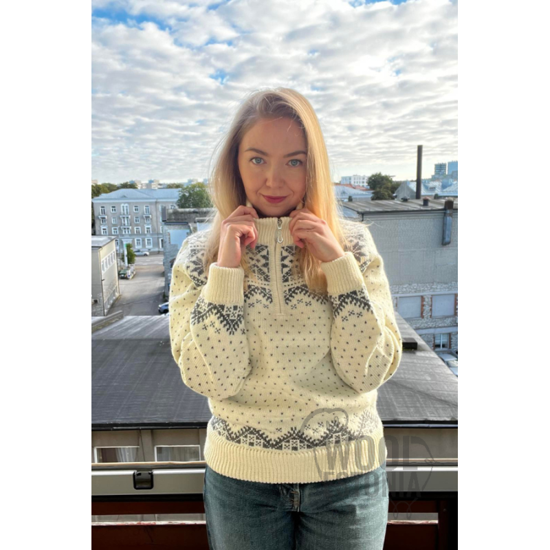 A cozy and warm knitted sweater made of 100% natural soft lambswool. This stylish woman's sweater with a comfortable half-zip and an original "Star" pattern would be a great addition to your autumn-winter wardrobe