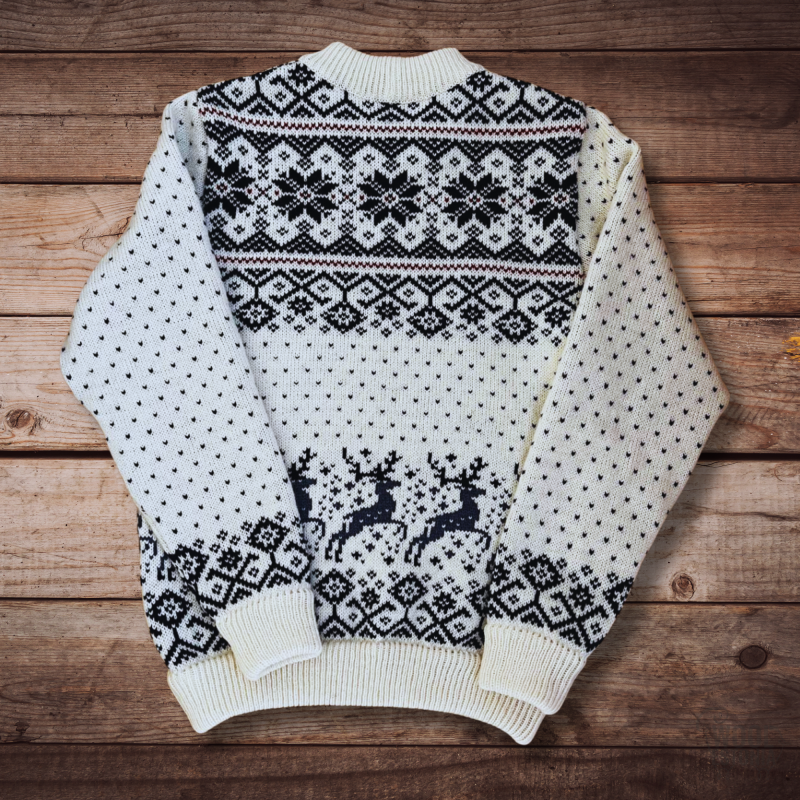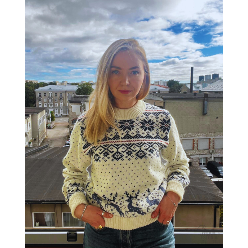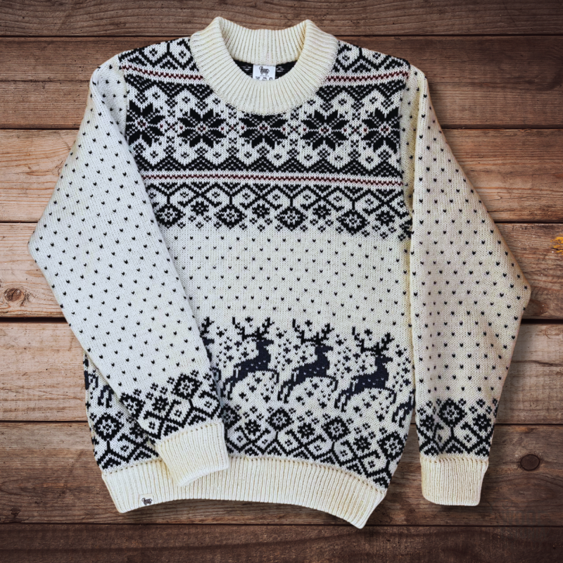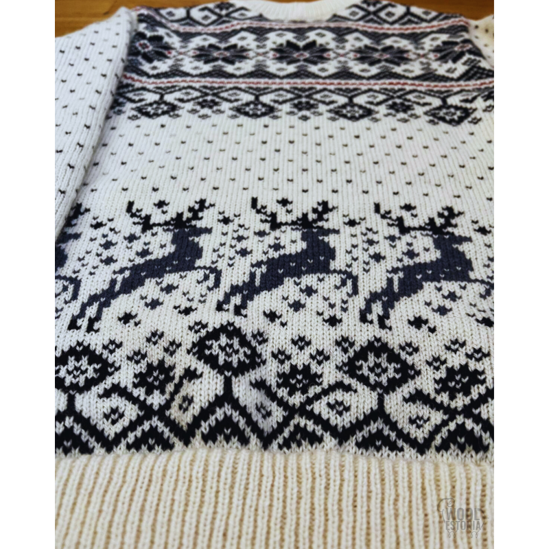 A cozy and warm knitted jumper made of 100% natural soft lambswool. This stylish woman's sweater in a classic style with an original "Deer" pattern would be a great addition to your autumn-winter wardrobe