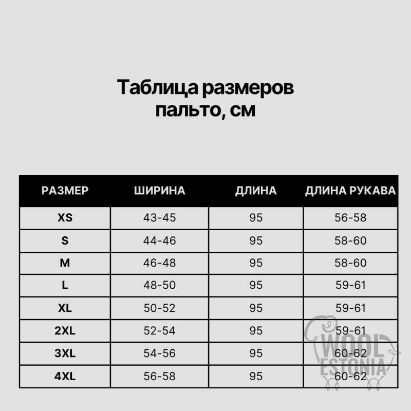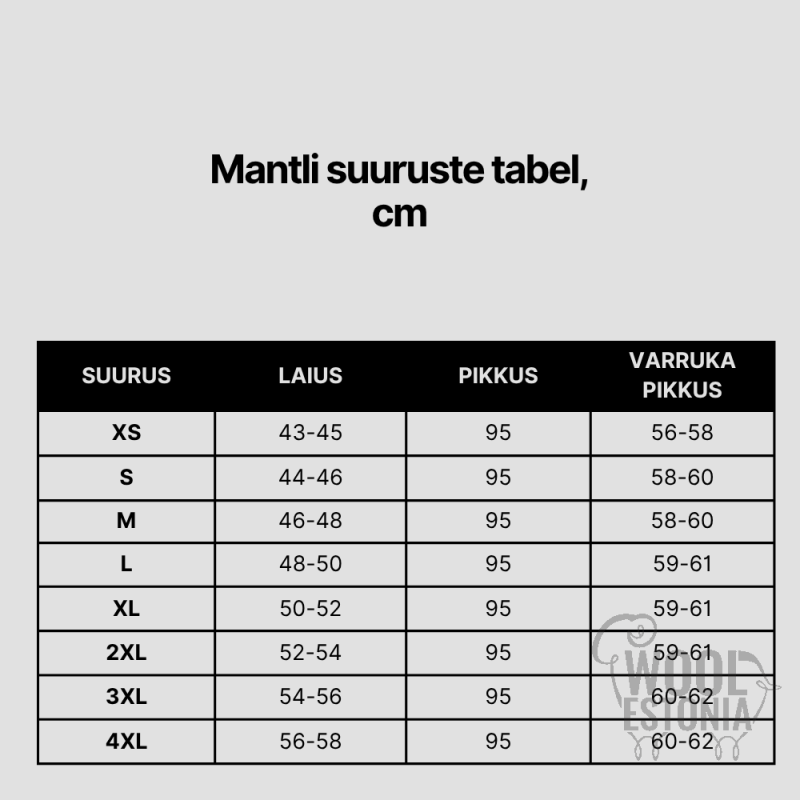 | Suurus | Toote laius, cm | Toote pikkus, cm | Varruka pikkus, cm |