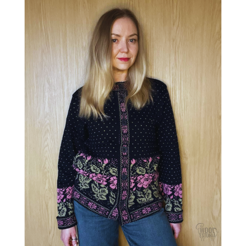 Naiste kampsun nööpidega, kaunistatud erksate roosidega on ideaalne valik neile, kes eelistavad hubasust ning ka eredust