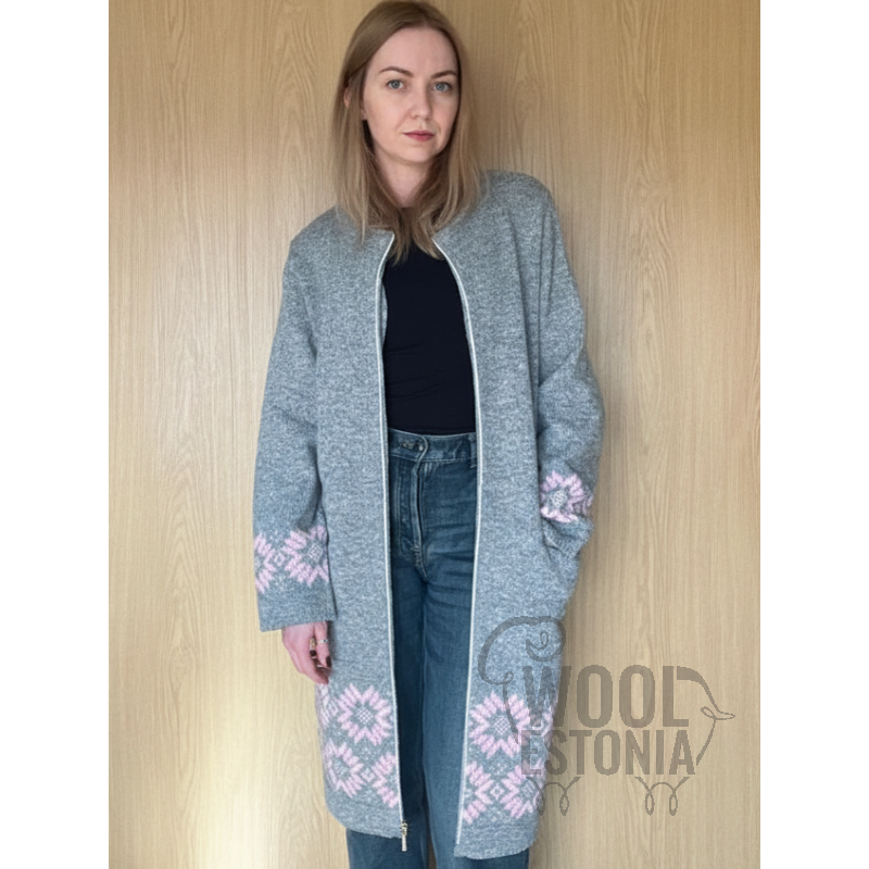 Удлинённый свободный крой, декоративный цветочный узор в розовых тонах на рукавах и подоле. Тёплое, мягкое и стильное.